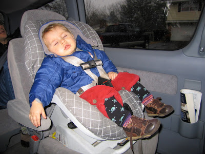 On colder days, Ben's parents would put the rain shield over the stroller to keep him warm (it's very good for wind as well as rain). Ben was nice enough to take naps in the stroller and let his parents keep wandering around Paris (visiting La Maison d'Astronomie and La Droguerie, a yarn and doodad store, among other places) while he slept. His parents took him to parks whenever they could, even when it was cold. Parks in France come with lots of instructions about what age should use what, but Ben happily played on everything he could reach. There was a particularly nice park across from the Bon Marché department store, which has a very nice toy department and a nice restaurant (Ben is very happy with his toy Parisian garbage truck, and enjoyed the lentil salad). We all had a wonderful time in Paris, and a great time hanging out with Grandpa Bill and Grandma Jan, who took great care of us. They fed us extremely well, and were willing to peel any number of "apples" (mandarin oranges) for Ben.